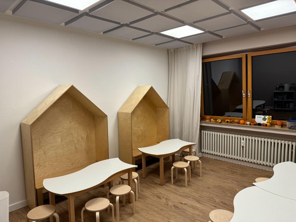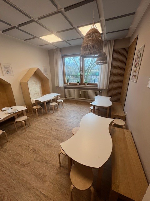 Die Cafeteria erstrahlt nun in einem ganz neuen Glanz – es sind wunderschöne Sitzhäuser eingezogen, die den Raum zu einem gemütlichen Rückzugsort machen. Die Wände wurden frisch gestrichen, und auch neue Sitzbänke sowie kleine Sitzgruppen laden zum Verweilen ein. Hier können die Kinder ab sofort in einer warmen und einladenden Atmosphäre gemeinsam mit ihren Freunden und den Erziehern ihr Frühstück genießen, Mittag essen und zwischendurch snacken.